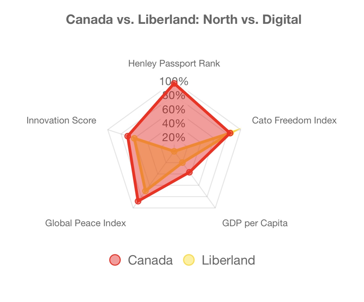 • Comparison: Canada’s soft-power diplomacy—peacekeeping, climate leadership, refugee resettlement—is Liberland’s fastest route to influence. Swap maple syrup for smart contracts.
