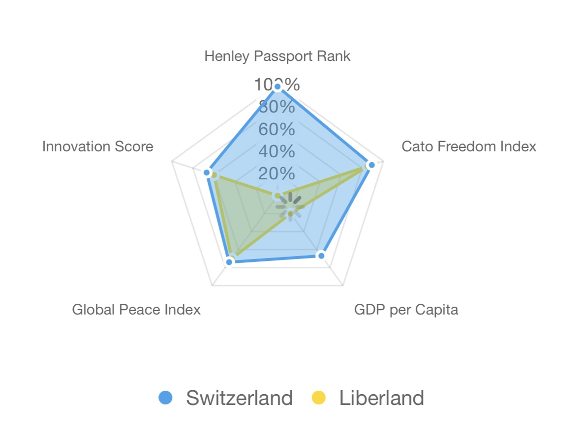 • Freedom Index: Switzerland ~8.9; Liberland ~8.5 (estimated).